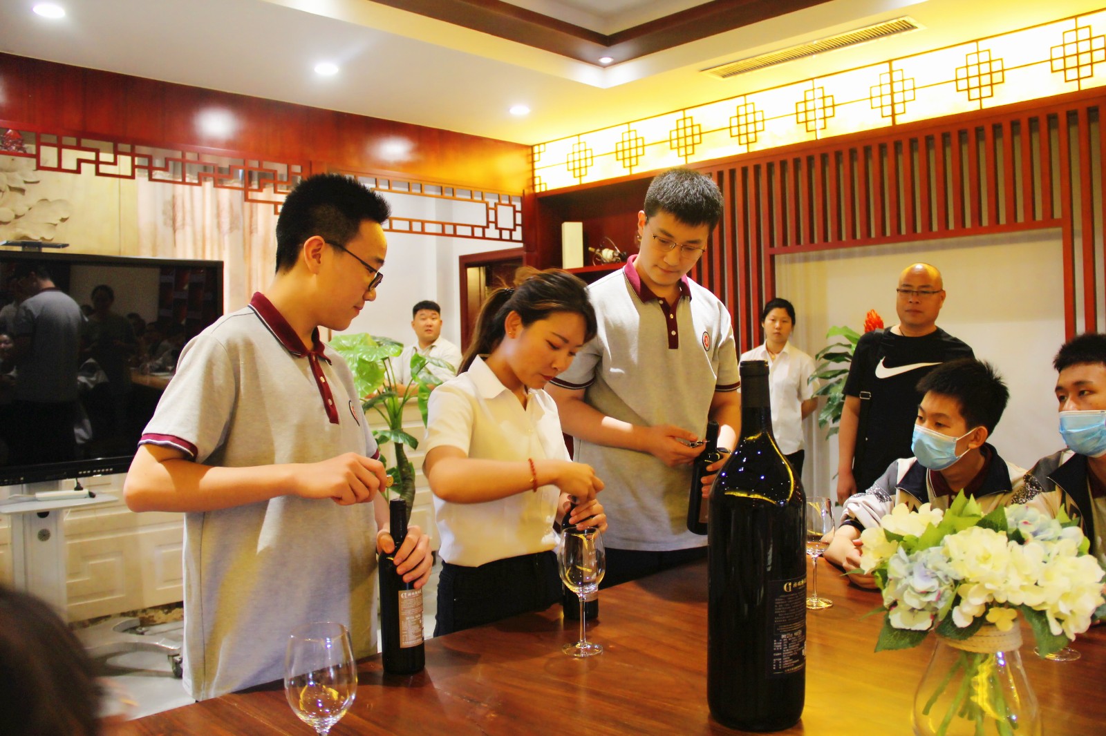 在參觀地下音樂酒窖之后,同學(xué)們進(jìn)入中式品鑒室,在專業(yè)品鑒師的帶領(lǐng)下,學(xué)會了如何正確開酒、倒酒,了解了品酒三部曲和正確的持杯、碰杯的姿勢。品味醇美紅酒,弘揚(yáng)紅酒文化,感受歷久彌新的紅酒魅力。